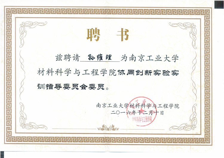 孫維理董事長(zhǎng)榮獲南京工業(yè)大學(xué)材料科學(xué)與工程學(xué)院授予的“協(xié)同創(chuàng)新實(shí)驗(yàn)實(shí)訓(xùn)指導(dǎo)委員會(huì)委員”。