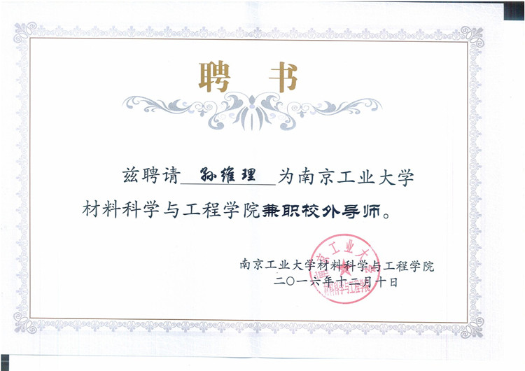 孫維理董事長(zhǎng)被南京工業(yè)大學(xué)材料科學(xué)與工程學(xué)院聘請(qǐng)為“兼職校外導(dǎo)師”。