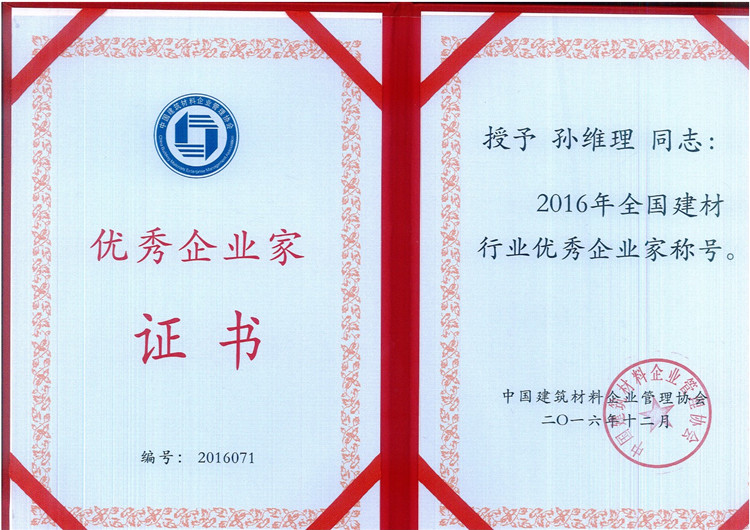 孫維理董事長(zhǎng)榮獲中國(guó)建筑材料企業(yè)管理協(xié)會(huì)頒發(fā)的“2016年全國(guó)建材行業(yè)優(yōu)秀企業(yè)家稱(chēng)號(hào)”。