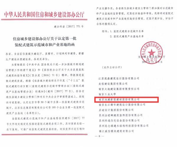 2017年11月9日,住房城鄉(xiāng)建設(shè)部辦公廳印發(fā)《關(guān)于認(rèn)定第一批裝配式建筑示范城市和產(chǎn)業(yè)基地的函》,南京旭建公司成為第一批按照《裝配式建筑產(chǎn)業(yè)基地管理辦法》認(rèn)定的國(guó)家“裝配式建筑產(chǎn)業(yè)基地”。