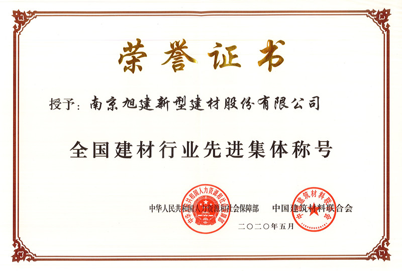 2020年8月14日人力資源社會保障部、中國建筑材料聯(lián)合會在北京友誼賓館召開了關(guān)于“全國建材行業(yè)先進集體、先進工作者和勞動模范表彰大會”,會上對來自全國的98個單位、95名個人進行了表彰,南京旭建新型建材股份有限公司榮獲“全國建材行業(yè)先進集體”稱號。